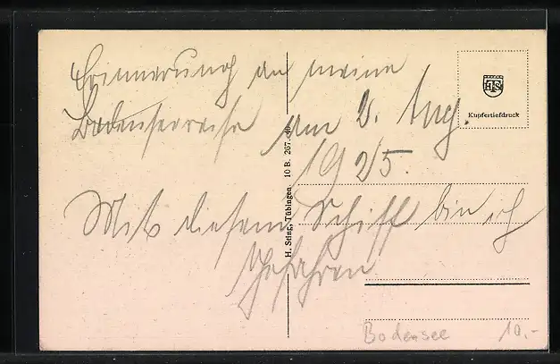 Personenbezogene Daten auf der Rückseite der Karte wurden durch blauen Textmarker unkenntlich gemacht. Die blauen Stellen sind auf die Vorderseite durchgeweicht und wirken sich negativ auf das Postkartenfoto aus