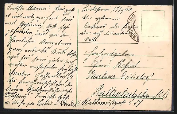 Personenbezogene Daten auf der Rückseite der Karte wurden durch blauen Textmarker unkenntlich gemacht. Die blauen Stellen sind auf die Vorderseite durchgeweicht und wirken sich negativ auf das Postkartenfoto aus
