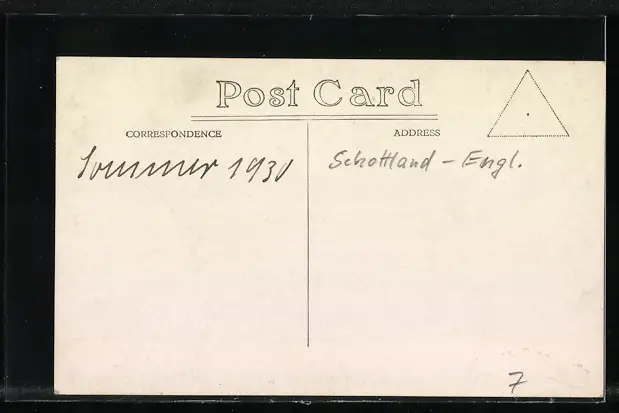 Personenbezogene Daten auf der Rückseite der Karte wurden durch blauen Textmarker unkenntlich gemacht. Die blauen Stellen sind auf die Vorderseite durchgeweicht und wirken sich negativ auf das Postkartenfoto aus