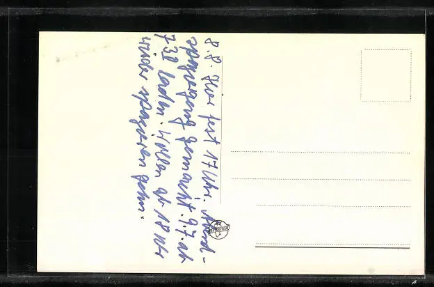 Personenbezogene Daten auf der Rückseite der Karte wurden durch blauen Textmarker unkenntlich gemacht. Die blauen Stellen sind auf die Vorderseite durchgeweicht und wirken sich negativ auf das Postkartenfoto aus