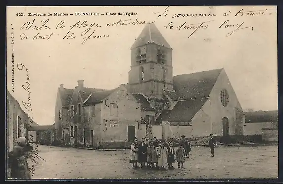AK Boinville, Place de l`Église avec groupe d`enfants devant l`église et bâtiments anciens