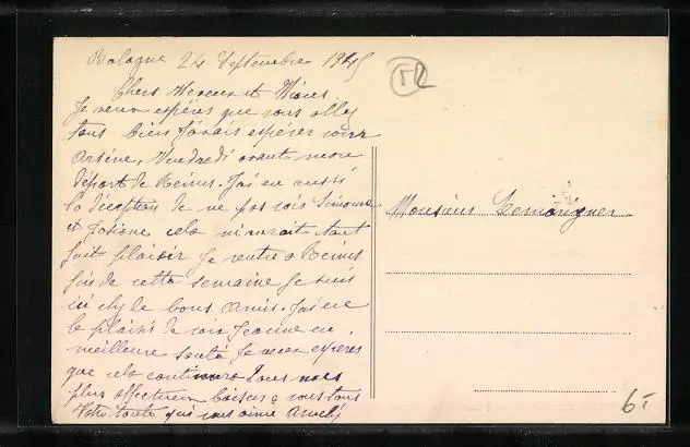 Personenbezogene Daten auf der Rückseite der Karte wurden durch blauen Textmarker unkenntlich gemacht. Die blauen Stellen sind auf die Vorderseite durchgeweicht und wirken sich negativ auf das Postkartenfoto aus