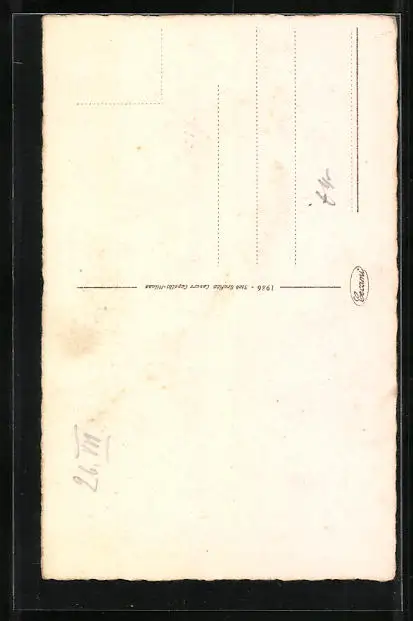 Personenbezogene Daten auf der Rückseite der Karte wurden durch blauen Textmarker unkenntlich gemacht. Die blauen Stellen sind auf die Vorderseite durchgeweicht und wirken sich negativ auf das Postkartenfoto aus