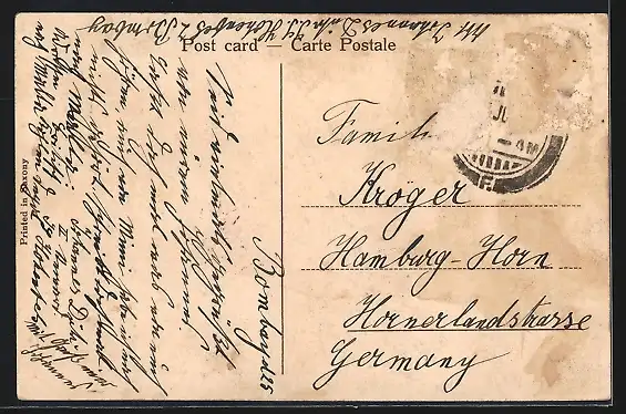 alte Ansichtskarte, gelaufen, Briefmarke entfernt, rückseitig Oberflächenschaden, guter Zustand