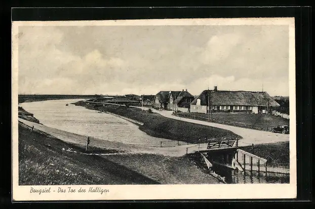 AK Bongsiel in den Halligen, Blick auf die Häuser am Ufer