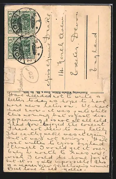 Personenbezogene Daten auf der Rückseite der Karte wurden durch blauen Textmarker unkenntlich gemacht. Die blauen Stellen sind auf die Vorderseite durchgeweicht und wirken sich negativ auf das Postkartenfoto aus