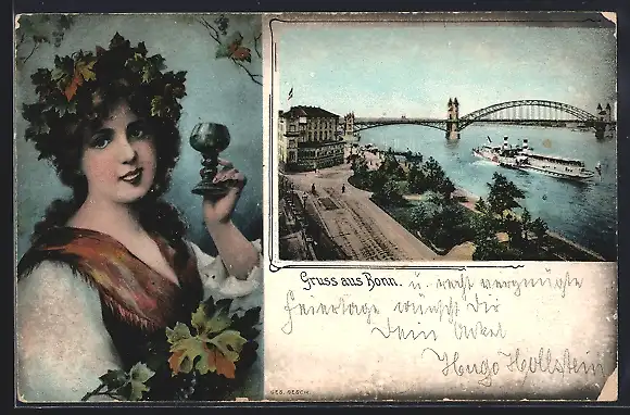 AK Bonn, Hotel mit Brücke und Dampfer, Frau trinkt Wein