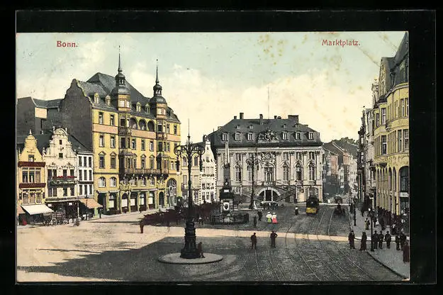 AK Bonn, Marktplatz mit Geschäft und Denkmal, Strassenbahn
