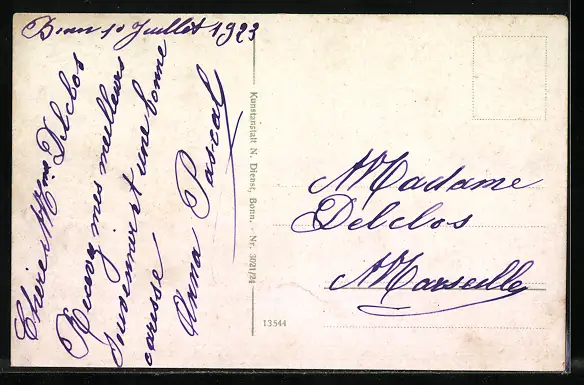 Personenbezogene Daten auf der Rückseite der Karte wurden durch blauen Textmarker unkenntlich gemacht. Die blauen Stellen sind auf die Vorderseite durchgeweicht und wirken sich negativ auf das Postkartenfoto aus