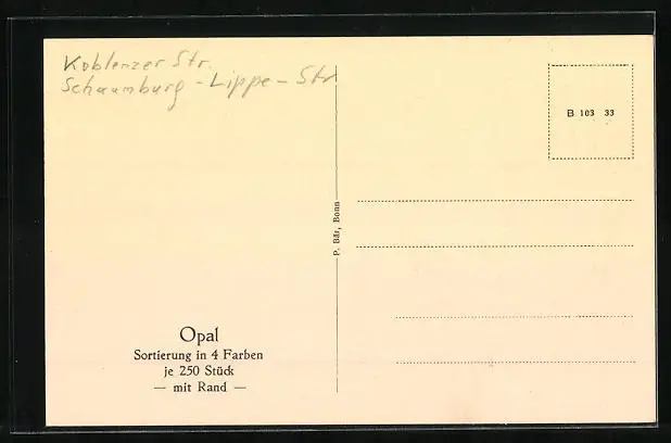 Personenbezogene Daten auf der Rückseite der Karte wurden durch blauen Textmarker unkenntlich gemacht. Die blauen Stellen sind auf die Vorderseite durchgeweicht und wirken sich negativ auf das Postkartenfoto aus