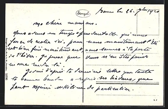 Personenbezogene Daten auf der Rückseite der Karte wurden durch blauen Textmarker unkenntlich gemacht. Die blauen Stellen sind auf die Vorderseite durchgeweicht und wirken sich negativ auf das Postkartenfoto aus