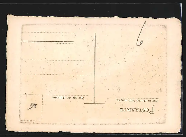 Personenbezogene Daten auf der Rückseite der Karte wurden durch blauen Textmarker unkenntlich gemacht. Die blauen Stellen sind auf die Vorderseite durchgeweicht und wirken sich negativ auf das Postkartenfoto aus