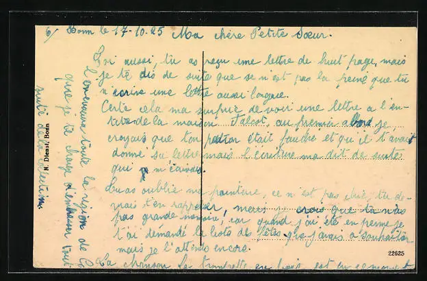 Personenbezogene Daten auf der Rückseite der Karte wurden durch blauen Textmarker unkenntlich gemacht. Die blauen Stellen sind auf die Vorderseite durchgeweicht und wirken sich negativ auf das Postkartenfoto aus