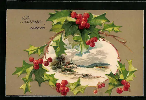 AK Bonne année, Winterlandschaft mit Stechpalmenzweigen