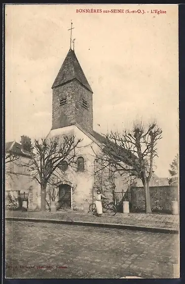 AK Bonnières-sur-Seine, L`Église et arbres devant la facade