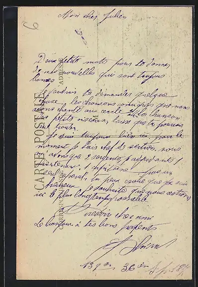 Personenbezogene Daten auf der Rückseite der Karte wurden durch blauen Textmarker unkenntlich gemacht. Die blauen Stellen sind auf die Vorderseite durchgeweicht und wirken sich negativ auf das Postkartenfoto aus