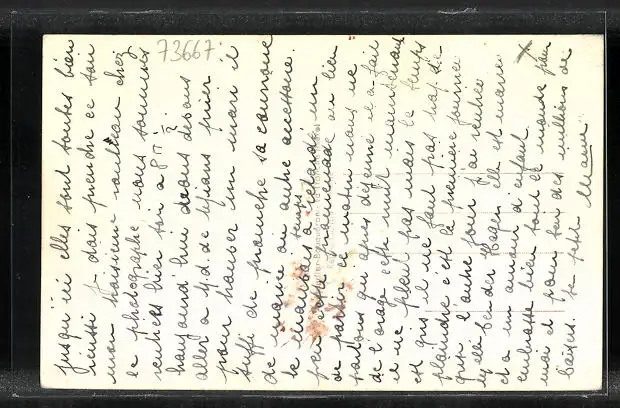 Personenbezogene Daten auf der Rückseite der Karte wurden durch blauen Textmarker unkenntlich gemacht. Die blauen Stellen sind auf die Vorderseite durchgeweicht und wirken sich negativ auf das Postkartenfoto aus