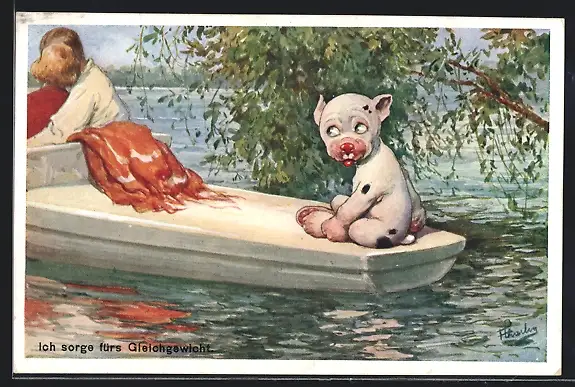AK Bonzo sitzt traurig auf dem Boot und beobachtet das Liebespaar, I take care of the balance