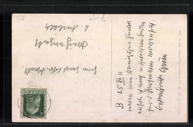 Personenbezogene Daten auf der Rückseite der Karte wurden durch blauen Textmarker unkenntlich gemacht. Die blauen Stellen sind auf die Vorderseite durchgeweicht und wirken sich negativ auf das Postkartenfoto aus