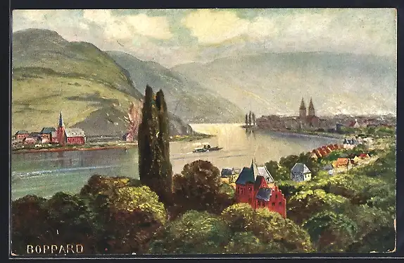 AK Boppard, Blick auf den Fluss mit Dampfer