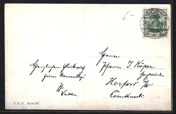 Personenbezogene Daten auf der Rückseite der Karte wurden durch blauen Textmarker unkenntlich gemacht. Die blauen Stellen sind auf die Vorderseite durchgeweicht und wirken sich negativ auf das Postkartenfoto aus
