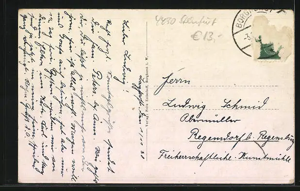 alte Ansichtskarte, gelaufen, Briefmarke entfernt, guter Zustand