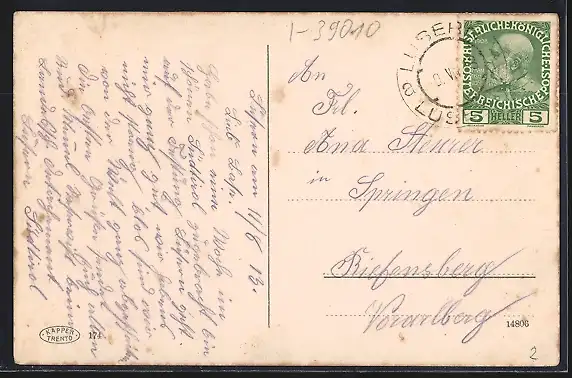 gelaufen 1913, Eckknick re. unten, Bugspur re. oben, guter Zustand