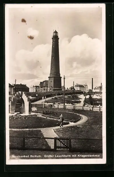 AK Borkum, Grosser Leuchtturm mit Kriegerdenkmal