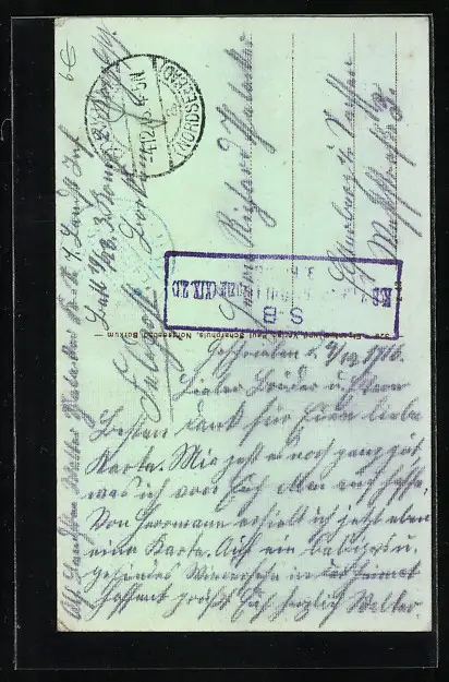 Personenbezogene Daten auf der Rückseite der Karte wurden durch blauen Textmarker unkenntlich gemacht. Die blauen Stellen sind auf die Vorderseite durchgeweicht und wirken sich negativ auf das Postkartenfoto aus