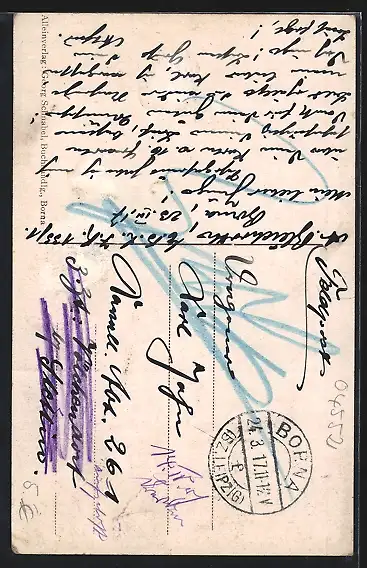Personenbezogene Daten auf der Rückseite der Karte wurden durch blauen Textmarker unkenntlich gemacht. Die blauen Stellen sind auf die Vorderseite durchgeweicht und wirken sich negativ auf das Postkartenfoto aus