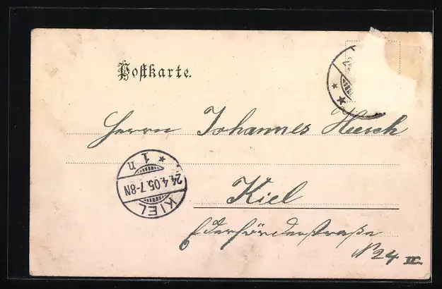 alte Ansichtskarte, gelaufen 1905, Briefmarke entfernt, rückseitig Oberflächenschaden, Bugspur oben li. u. re. Mitte, guter Zustand