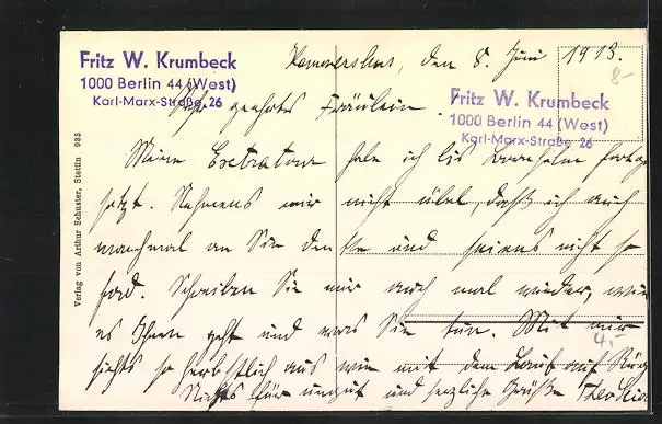 Personenbezogene Daten auf der Rückseite der Karte wurden durch blauen Textmarker unkenntlich gemacht. Die blauen Stellen sind auf die Vorderseite durchgeweicht und wirken sich negativ auf das Postkartenfoto aus