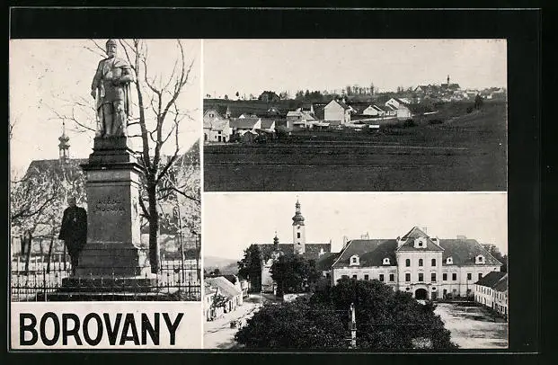 AK Borovany, Marktplatz, Denkmal, Gesamtansicht