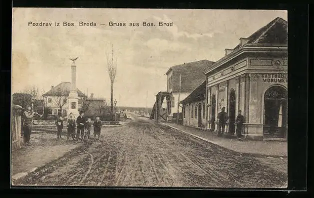 AK Bos. Brod, Strassenpartie mit Monument und Gasthaus Monument