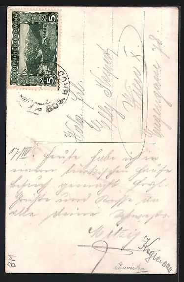 Personenbezogene Daten auf der Rückseite der Karte wurden durch blauen Textmarker unkenntlich gemacht. Die blauen Stellen sind auf die Vorderseite durchgeweicht und wirken sich negativ auf das Postkartenfoto aus