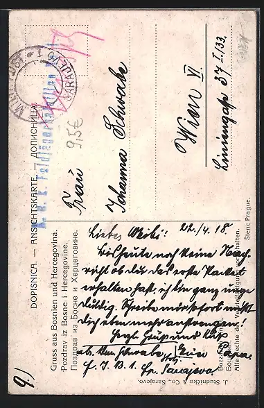 Personenbezogene Daten auf der Rückseite der Karte wurden durch blauen Textmarker unkenntlich gemacht. Die blauen Stellen sind auf die Vorderseite durchgeweicht und wirken sich negativ auf das Postkartenfoto aus