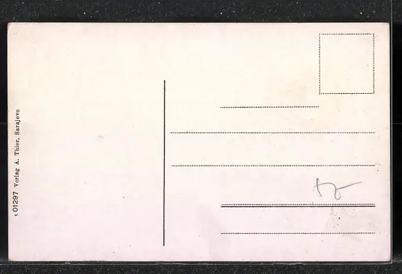 Personenbezogene Daten auf der Rückseite der Karte wurden durch blauen Textmarker unkenntlich gemacht. Die blauen Stellen sind auf die Vorderseite durchgeweicht und wirken sich negativ auf das Postkartenfoto aus
