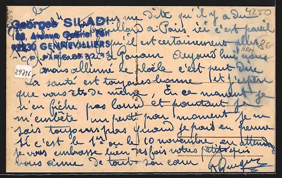 Personenbezogene Daten auf der Rückseite der Karte wurden durch blauen Textmarker unkenntlich gemacht. Die blauen Stellen sind auf die Vorderseite durchgeweicht und wirken sich negativ auf das Postkartenfoto aus