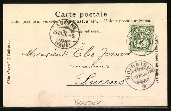 Personenbezogene Daten auf der Rückseite der Karte wurden durch blauen Textmarker unkenntlich gemacht. Die blauen Stellen sind auf die Vorderseite durchgeweicht und wirken sich negativ auf das Postkartenfoto aus