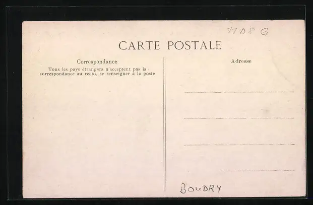 Personenbezogene Daten auf der Rückseite der Karte wurden durch blauen Textmarker unkenntlich gemacht. Die blauen Stellen sind auf die Vorderseite durchgeweicht und wirken sich negativ auf das Postkartenfoto aus