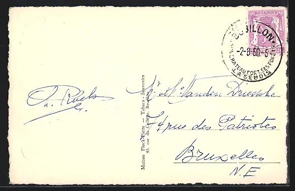 Personenbezogene Daten auf der Rückseite der Karte wurden durch blauen Textmarker unkenntlich gemacht. Die blauen Stellen sind auf die Vorderseite durchgeweicht und wirken sich negativ auf das Postkartenfoto aus
