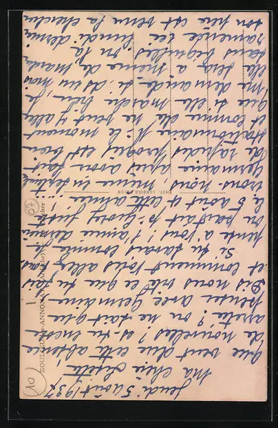 Personenbezogene Daten auf der Rückseite der Karte wurden durch blauen Textmarker unkenntlich gemacht. Die blauen Stellen sind auf die Vorderseite durchgeweicht und wirken sich negativ auf das Postkartenfoto aus
