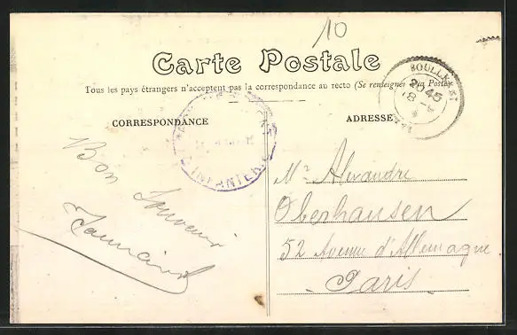 Personenbezogene Daten auf der Rückseite der Karte wurden durch blauen Textmarker unkenntlich gemacht. Die blauen Stellen sind auf die Vorderseite durchgeweicht und wirken sich negativ auf das Postkartenfoto aus