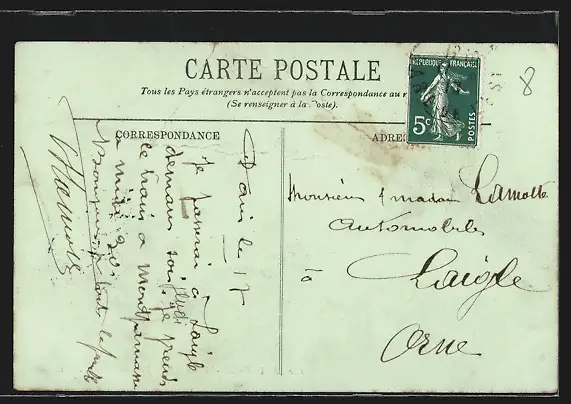 Personenbezogene Daten auf der Rückseite der Karte wurden durch blauen Textmarker unkenntlich gemacht. Die blauen Stellen sind auf die Vorderseite durchgeweicht und wirken sich negativ auf das Postkartenfoto aus