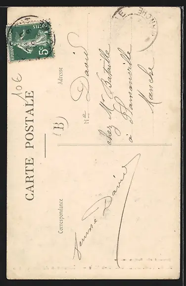 Personenbezogene Daten auf der Rückseite der Karte wurden durch blauen Textmarker unkenntlich gemacht. Die blauen Stellen sind auf die Vorderseite durchgeweicht und wirken sich negativ auf das Postkartenfoto aus