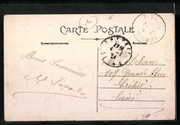 Personenbezogene Daten auf der Rückseite der Karte wurden durch blauen Textmarker unkenntlich gemacht. Die blauen Stellen sind auf die Vorderseite durchgeweicht und wirken sich negativ auf das Postkartenfoto aus