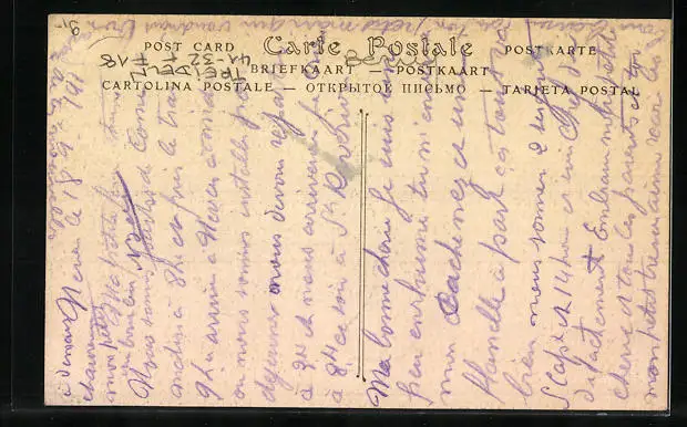 Personenbezogene Daten auf der Rückseite der Karte wurden durch blauen Textmarker unkenntlich gemacht. Die blauen Stellen sind auf die Vorderseite durchgeweicht und wirken sich negativ auf das Postkartenfoto aus