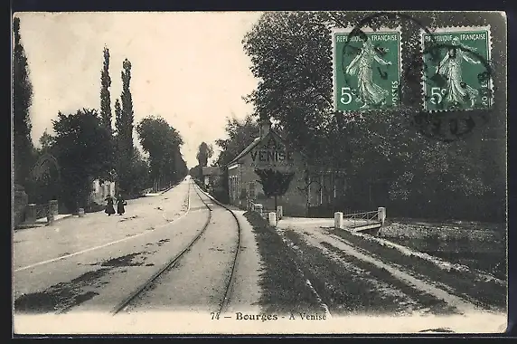AK Bourges, Route vers Venise avec voie ferrée et arbres alignés