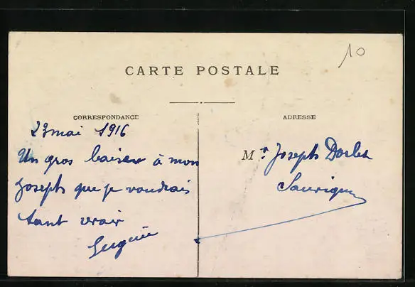 Personenbezogene Daten auf der Rückseite der Karte wurden durch blauen Textmarker unkenntlich gemacht. Die blauen Stellen sind auf die Vorderseite durchgeweicht und wirken sich negativ auf das Postkartenfoto aus