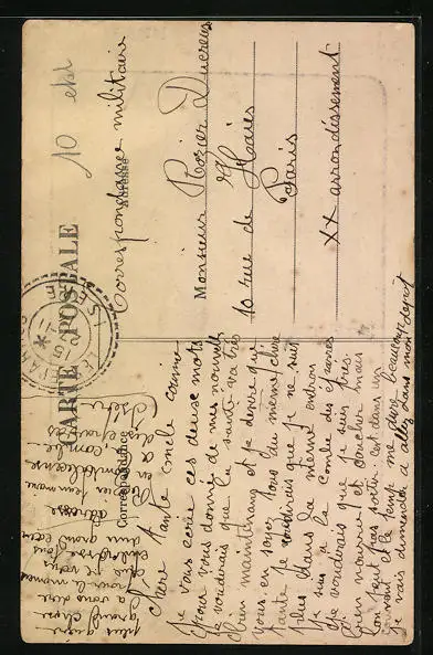 Personenbezogene Daten auf der Rückseite der Karte wurden durch blauen Textmarker unkenntlich gemacht. Die blauen Stellen sind auf die Vorderseite durchgeweicht und wirken sich negativ auf das Postkartenfoto aus